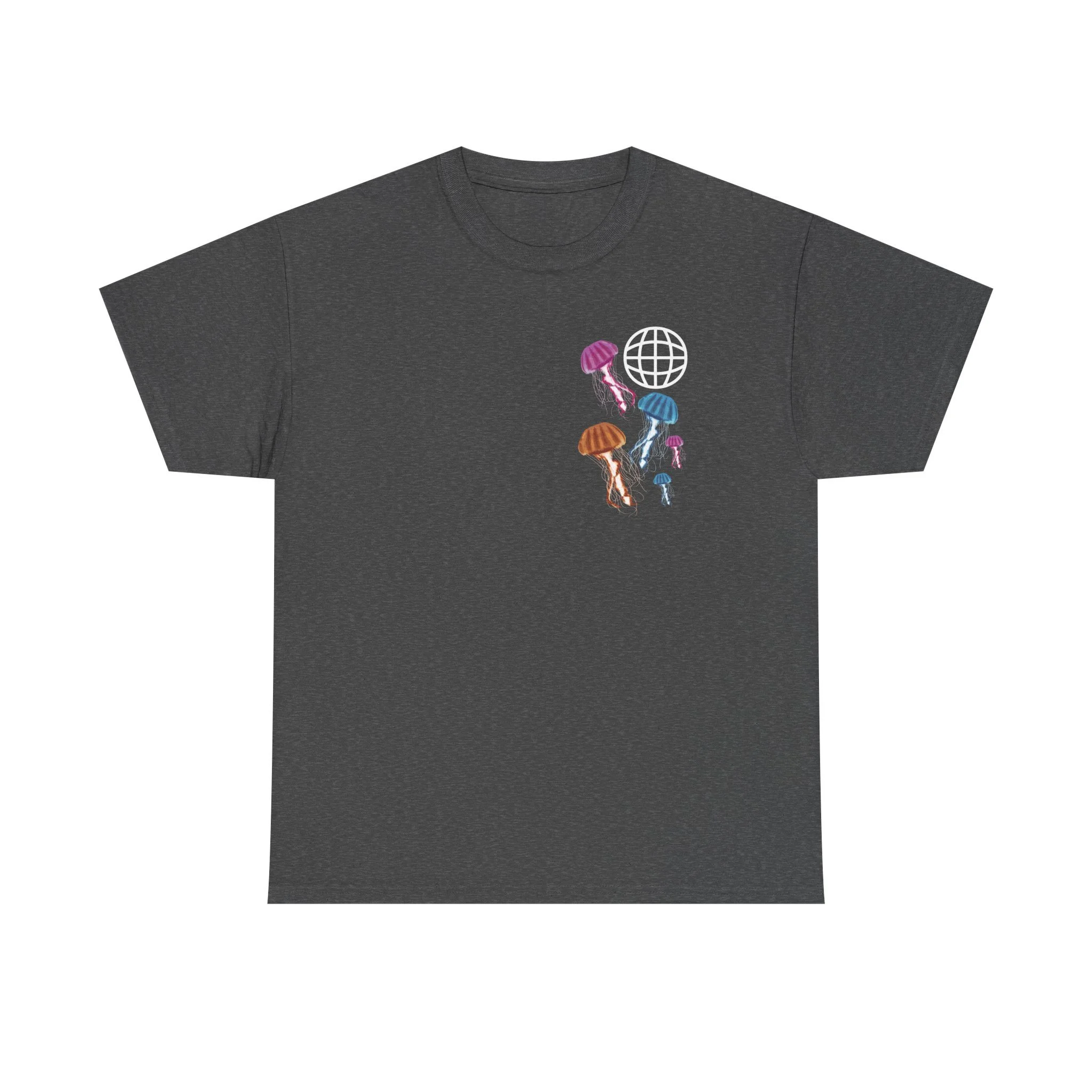 This unisex heavy cotton t-shirt from SPLICED shows multiple jellyfish and our logo on the front, with a chill jellyfish on the back we've generously named Chester. Show off your bioluminescence with the Jellyfish T-shirt.